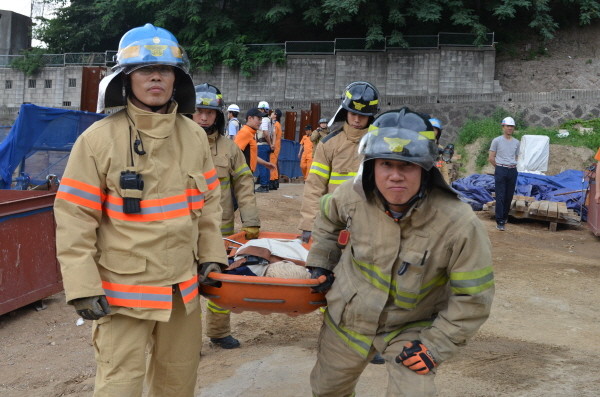 서울 서대문소방서가 최근 북아현 1-3재정비촉진구역 신촌현장 공사장 타워크레인에서 도상훈련 및 인명구조 현지적응훈련을 실시했다. 사진은 이날 훈련에 참여한 소방대원들이 인명구조 훈련을 진행 중인 모습.(사진제공=서대문소방서)