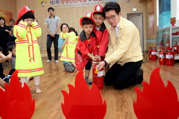 1일 오전 정원오 서울 성동구청장이 민선6기 1주년을 맞아 성동생명안전배움터에 방문했다. 사진은 안전체험을 신청한 아이들과 함께 소방교육에 나선 정 구청장의 모습.(사진제공=성동구청)