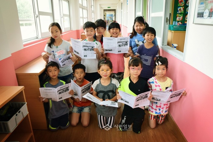 전남 담양군 월산초등학교가 최근 1년에 2회 발행하던 학교소식지를 매월 발행하기로 한 가운데 전교어린이회 기자단 어린이들이 직접 발행한 신문을 들고 기념촬영을 하고 있다.