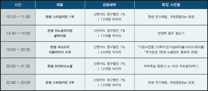 이번 방송은 홈인테리어 전문 쇼호스트들이 진행한다. 오전 10시부터 ‘한샘 스타일키친’ 1차 방송을 시작으로 오후 1시40분부터 ‘한샘 이노슬라이팅 붙박이장’, 오후 7시20분 부터 ‘한샘 퍼스티지 리클라이너 소파’, 오후 8시25분부터 ‘한샘 하이바스 노블’, 오후 10시40분 부터는 ‘한샘 스타일키친’ 2차 방송까지 총 5회 방송이 진행된다.