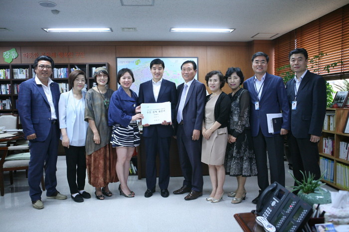 최근 강동구청이 환경, 도시계획·경제, 교육·문화, 복지·건강, 교통, 안전·행복 6개 분야별 주민 대표들과 함께 ‘2030 장기발전종합계획’ 수립을 위한 '주민 간담회'를 열었다. 사진은 대표들로부터 주민정책제안서를 전달받고 있는 이해식 강동구청장(왼쪽에서 5번째)의 모습.(사진제공=강동구청)