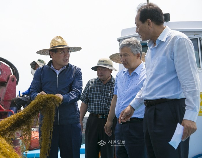 | ▲ 박철환 군수(왼쪽)는 지역특색에 맞는 농수산물 산업 육성을 위해 다양한 사업을 추진 중인 가운데 모자반 수거 현장을 방문해 관계자들과 이야기를 나누고 있다. | ||