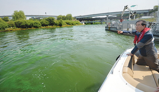 한강 하류에 녹조가 발생해 지난달 30일자로 조류경보가 발령된 가운데 박원순 서울시장이 5일 서울 선유도 공원 일대 한강에서 녹조 현상을 점검하고 있다.