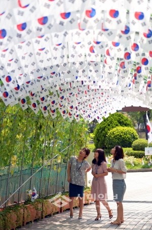 동대문구가 구청 광장에 최근 70주년 광복절을 기념하고자 '태극기 터널'을 조성했다. 사진은 수 백개의 태극기가 걸려 있는 터널을 지나고 있는 구청 직원들의 모습.(사진제공=동대문구청)