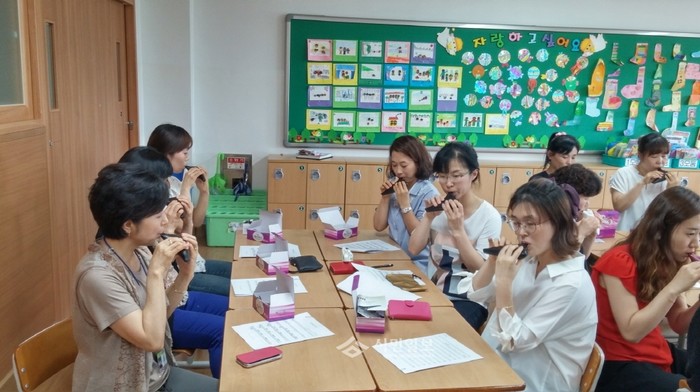 전남 순천시 좌야초등학교가 최근 교사 오카리나 동아리 '노래하는 오카리나'를 운영했다. 사진은 참여 교사들이 오카리나를 연주하며 동아리 활동을 펼치고 있는 모습.(사진제공=전남교육청)