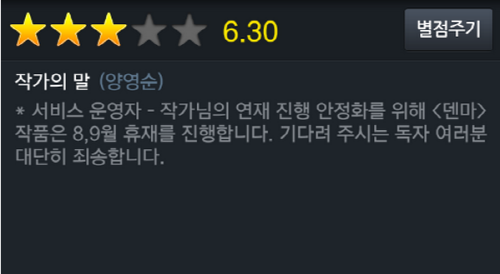 앞서 네이버웹툰 서비스 담당자는 웹툰 '덴마'의 연재 안정화를 위해 2014년 8~9월 휴재를 공지한 바 있다.