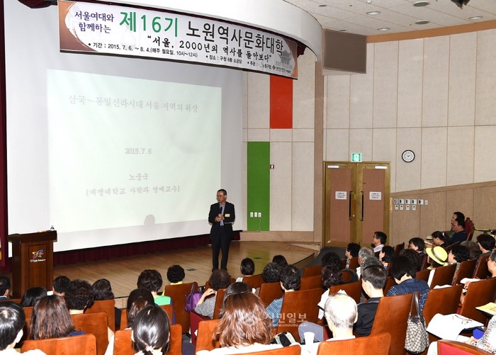 노원구가 지난 6일 오전 10시 구청 6층 소강당에서 서울여대와 함께 하는 '제16기 노원역사문화대학' 개강식을 개최한 가운데 노중국 계명대 명예교수가 강의를 진행하고 있다.(사진제공=노원구청)