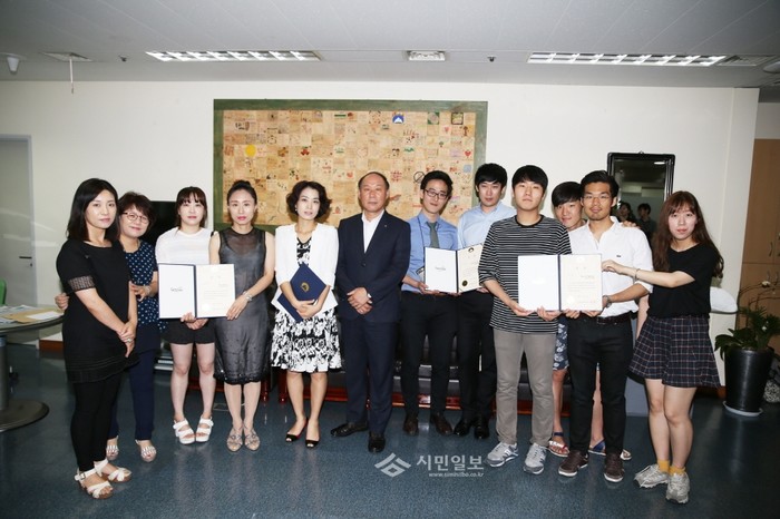 서울 도봉구가 추진한 '2015년 도봉구 사회적경제 창업아이디어 공모'에 선정된 단체 대표들이 최근 구청사에서 열린 시상식에 참석해 김재정 부구청장(왼쪽에서 6번째)과 함께 기념촬영을 하고 있다. 공모에 최종선정된 단체에는 허브센터내 인큐베이팅실 입주 등 다양한 지원이 제공된다. (사진제공=도봉구청)