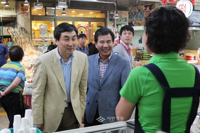 최근 중동호흡기증후군(메르스) 사태로 인한 경기침체로 어려움을 겪고있는 암사시장에 성임제 서울시 강동구의회 의장(오른쪽)과 새정치민주연합 이종걸 원내대표가(왼쪽) 직접 방문해 장을 보고, 시장상인들을 격려하고 있다.