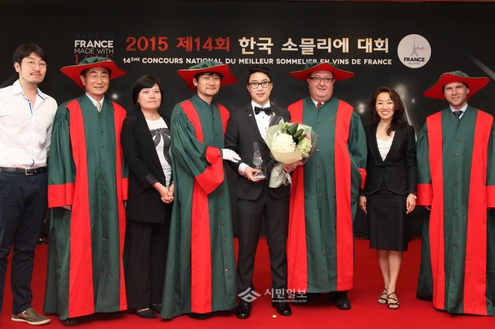 | ▲ 7일 밀레니엄 힐튼 호텔에서 펼쳐진 2015 한국 소믈리에 대회에서 우승자 안중민 소믈리에(오른쪽에서 네번째)가 심사위원장 장 파스칼 포베르(오른쪽에서 세번째), 소펙사 코리아 정석영 소장(오른쪽에서 두번째), 심사위원 및 관계자들과 기념사진을 찍고 있다. | ||