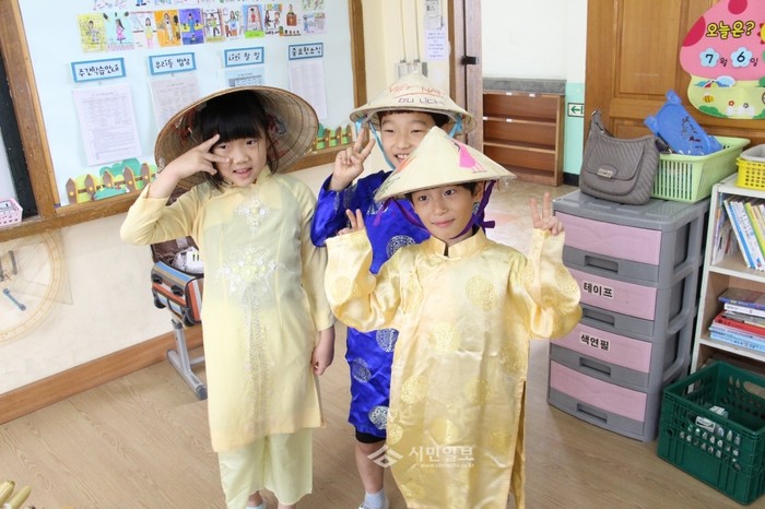 경기 부천시 삼정초등학교는 최근 어울림학교 프로그램 '찾아가는 다문화교실'을 실시했다. 사진은 다문화교실 체험에 참여한 학생들이 베트남 전통의상을 입고 기념촬영한 모습.(사진제공=부천교육지원청)