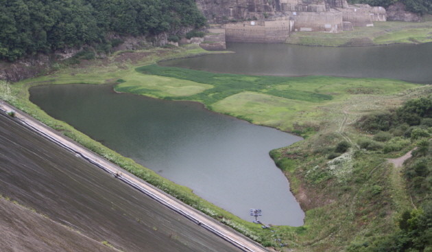 최악의 가뭄이 계속되고 있는 가운데 8일 오후 강원 화천군 화천읍 동촌리 최북단에 위치한 평화의 댐 상류가 바닥을 드러내고 있다.