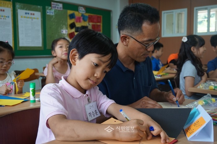 전남 곡성군 석곡초등학교가 최근 학생들을 대상으로 '가족과 함께하는 북아트 교실'을 개최했다. 사진은 이날 북아트 교실에 참여한 한 어린이가 아빠와 함께 책을 직접 만들고 있는 모습.(사진제공=전남교육지원청)