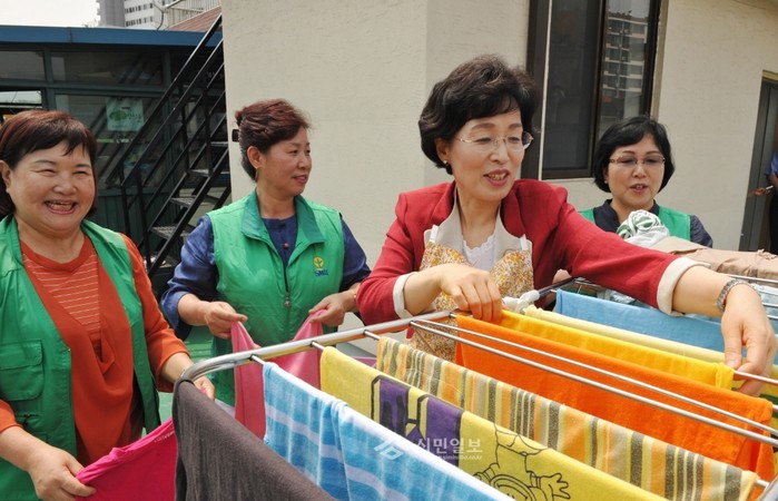 | ▲ 자원봉사자들과 함께 빨래를 넣고있는 박춘희 구청장 | ||