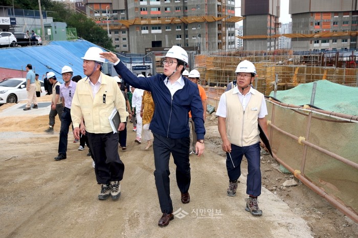 정원오 성동구청장(가운데)이 지난 7일 '옥수제13구역 주택재개발 공사현장 점검'에 나서 관계자들과 건설 공사현장을 둘러보며 태풍·집중호우 발생시 발생할 수 있는 문제를 점검하고 있다.(사진제공=성동구청)