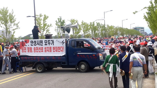 9일 오후 전남 나주혁신도시 한전 본사 앞에서 고압송전철탑과 송전선로 건설에 반대하는 경기도 안성시민대책위원회 소속 주민 1000여명과 지역구국회의원 인 새누리당 김학용 의원, 황은성 안성시장, 광역, 기초의원들이 참가한 가운데 대규모 항의 집회가 열렸다.