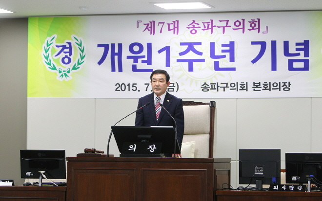 임춘대 의장은 기념사를 통해 “작년 7월 이 자리에서 구민여러분 앞에 한 목소리로 ‘의원선서’를 하며 제7대 의회의 새로운 출발을 알리고 구민의 권익과 복리를 위한 굳은 각오를 다졌던 것이 엊그제 같은데 벌써 1년이라는 시간이 지났다. 지난 1년 동안 모든 의원들이 구민의 삶에 직결된 안전과 교통, 지역경제, 각종 생활불편 사항 개선에 초점을 두고 의정활동에 최선을 다해왔다. 앞으로 남은 기간 동안 ‘초심불망 마부작침(初心不忘 磨斧作針)’의 정신으로 구민 삶의 질 향상과 구정발전을 위해 노력하여 구민에게 사랑받는 송파구 의회를 만들어 가겠다”라며 개원 1주년 소감과 함께 다짐을 밝혔다.