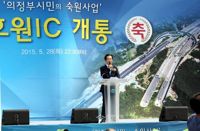 | ▲ 총 552억원의 사업비가 투입된 호원IC가 지난 5월28일 개통됐다. 사진은 호원IC 개통식에 참석한 안병용 시장이 축사를 하고 있는 모습. | ||