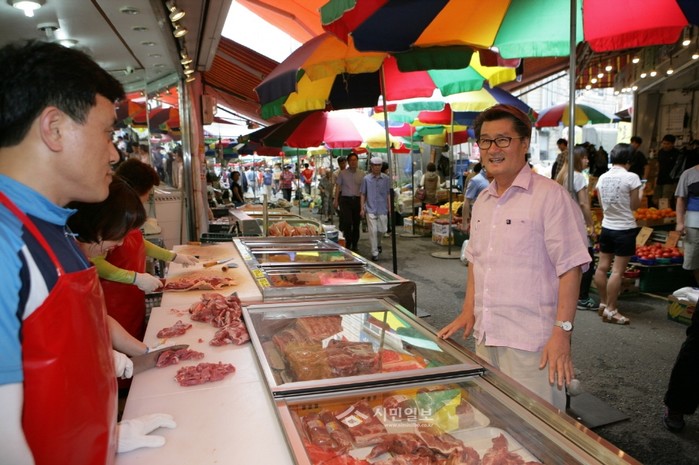 최근 유종필 관악구청장이 중동호흡기증후군(메르스)으로 위축된 지역경제를 살리기 위해 지역내 전통시장을 직접 찾아 상인들에게 애로사항을 청취하고 있다.(사진제공=관악구청)