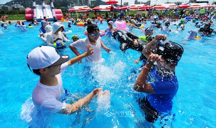 동대문구는 지난 11일 중랑천 제1체육공원에 '동대문구 야외수영장'을 개장하고 운영에 들어갔다. 사진은 이날 수영장을 찾은 어린이들이 즐겁게 물놀이를 하고 있는 모습.(사진제공=동대문구청)