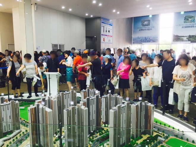 | ▲ 지난 10일 오픈한 자이 더 익스프레스 견본주택에 많은 사람들이 몰려 붐비는 가운데 내방객들이 단지 모형의 설명을 듣고 있다. | ||