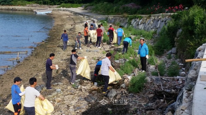 전남 완도군은 최근 약산면 장용리 해안가 일원에서 주민, 어촌계장, 수산업경영인연합회원 등이 참여한 가운데 해안가 청소를 실시했다. 사진은 이날 참여자들이 폐스티로폼과 폐어구 등을 수거하고 있는 모습.(사진제공=완도군청)