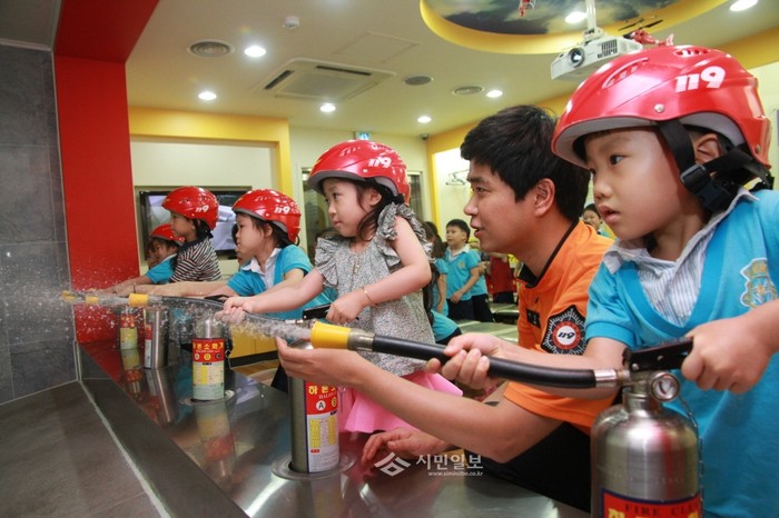 서울 구로소방서는 지난 13일 오전 10시30분 일신유치원 원생들을 본서 3층에 마련된 소방안전체험교실로 초청해 '우리는 안전 어린이' 체험교육을 실시했다. 사진은 이날 어린이들이 소방대원의 지도에 따라 물소화기를 사용하고 있는 모습.(사진제공=구로소방서)