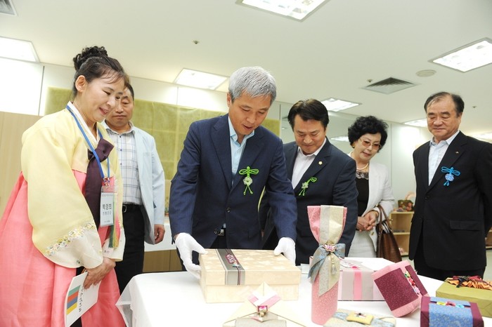 경기 오산시는 지난 13일 은계동에서 '전통문화 창작 체험관 개관식 및 오픈 기념 전시회'를 개최했다. 사진은 이날 개관식을 찾은 곽상욱 시장(가운데)이 전시된 공예품을 살펴보고 있는 모습.(사진제공=오산시청)