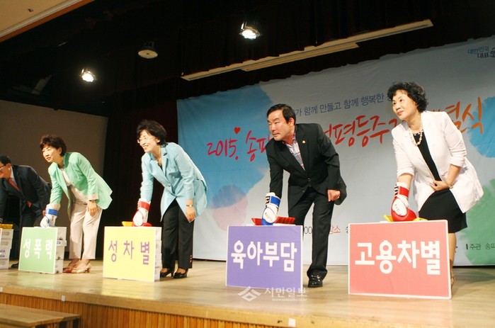 최근 임춘대 서울 송파구의회 의장(오른쪽 두 번째)이 송파여성문화회관 소극장에서 열린 '2015 양성평등주간 기념식' 행사에 참석해 성폭력, 성차별, 육아부담, 고용차별을 없애자는 퍼포먼스를 하고 있다.