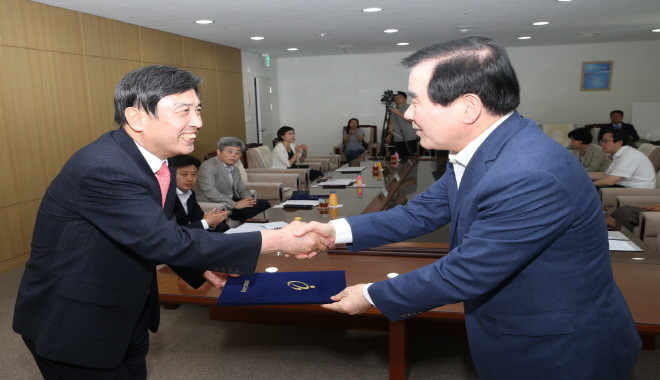 충남교육청은 14일 본청 제5회의실에서 도의회·대학교·자살예방협회·모래놀이상담협회 관계자 9명으로 구성된 '자살예방 및 생명존중문화 조성 위원회'에 대한 위촉식을 진행했다. 사진은 김지철 교육감(오른쪽)이 위원회 회원에게 위촉장을 전달하며 악수하고 있는 모습.(사진제공=충남교육청)