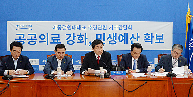 새정치민주연합 이종걸 원내대표가 14일 오전 서울 여의도 국회에서 추경 관련 기자간담회를 하고 있다. 이 원내대표는 “이번 추가경정 예산의 목적은 메르스 대응과 민생의 고통을 덜어드리기 위한 조치인데 정부가 짜온 추경은 심각하다”며 “비상식적ㆍ부실 추경으로 허용할 수 없다”고 말했다.