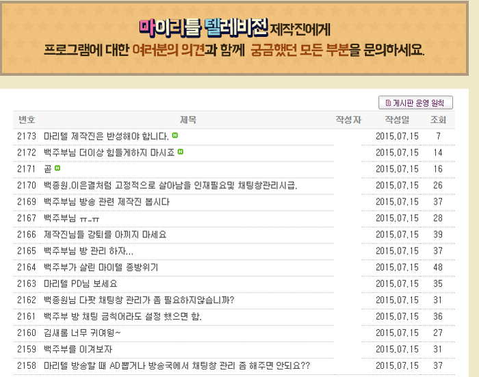 | ▲ 마리텔 채팅창 악플과 관련해 제작진에게 악플러 제재와 강퇴 시스템 도입을 요청하는 누리꾼들의 글이 올라왔다. (사진출처=마리텔 시청자 게시판 캡쳐) | ||