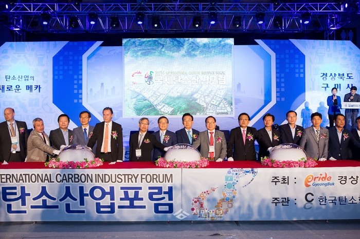 | ▲ 남유진 경북 구미시장(왼쪽 일곱번째)이 구미코에서 개최된 탄소산업 포럼에 참석해 내빈들과 함께 개회식 행사를 하고 있다. | ||