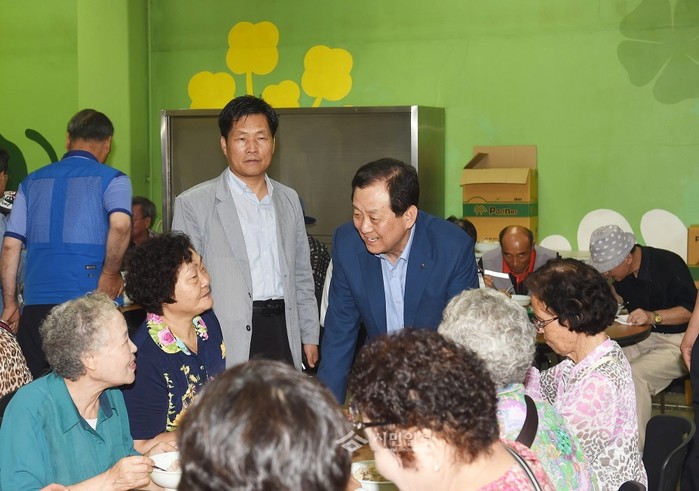 이교범 경기 하남시장(가운데)이 지난 14일 다목적복지관에서 열린 '하남시지체장애인협회 주최 초복맞이 나눔행사장'에 방문해 노인들과 덕담을 나누고 있다.(사진제공=하남시청)