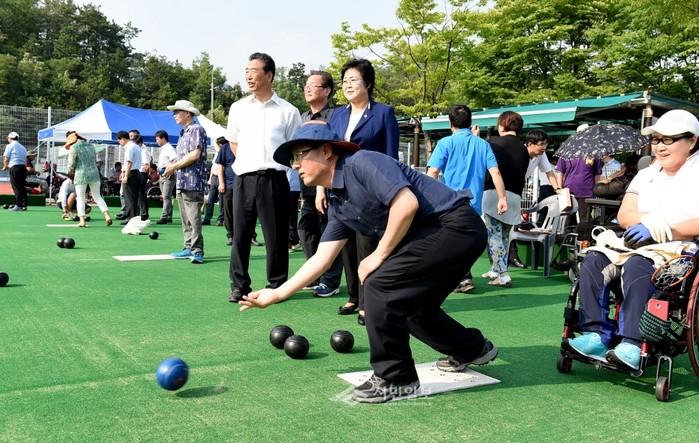 서울 노원구는 지난 14일 오후 4시 불암산종합스타디움내 다목적구장에서 '장애인 체육시설인 론볼장 개장식'을 개최했다. 사진은 김성환 구청장(가운데)이 본행사가 끝난 후 주민들과 함께 론볼 시범경기를 하고 있는 모습.(사진제공=노원구청)
