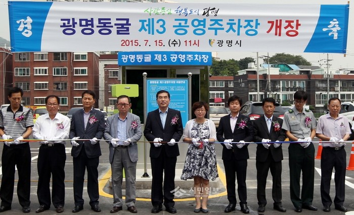 [광명=류만옥 기자]15일 경기 광명시가 주차장 166면, 대형 6면 등 총 183대의 차량 주차가 가능한 5475㎡ 규모로 건설한 '광명동굴 제3공영주차장 개장식'에 참석한 양기대 시장, 나상성 의장, 주민 등 150명이 테이프 커팅식을 진행하고 있다.