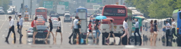 햇빛이 강하게 내리쬐는 폭염이 이어진 15일 오후 서울 여의도공원 앞 도로에서 아지랑이가 피어오르고 있다.