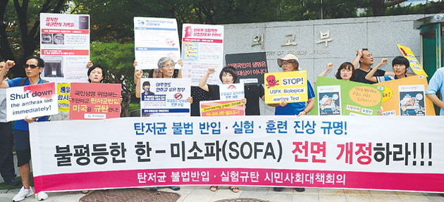탄저균 배달사고 등을 논의하는 소파(한미 양국의 주한미군 주둔군 지위 협정·SOFA) 합동위원회 회의가 열리는 15일 오후 서울 종로구 외교통상부앞에서 탄저균 불법 반입·실험규탄 시민사회대책회의 회원들이 탄저균 불법 반입 진상규명과 소파 개정을 촉구하는 구호를 외치고 있다.