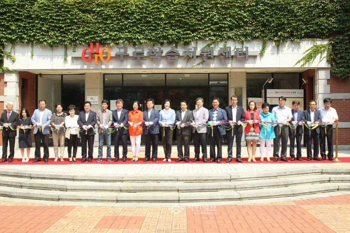 서울 구로구가 지난 15일 개최한 '구로학습지원센터 개관식'에 참석한 이성 구청장(오른쪽에서 10번째)과 관계자들이 리본커팅식에서 리본을 자르고 있다.(사진제공=구로구청)