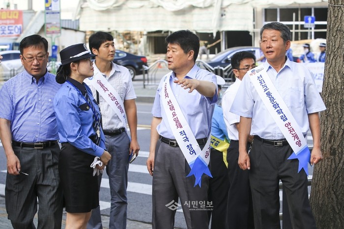 인천 계양구가 16일 지역내 명현초등학교 인근에서 계양경찰서, 계양구녹색어머니연합회, (사)인천계양모범운전자회, 한림병원, 명현초등학교 교사 및 학생 등 70여명이 참석한 가운데 '어린이 교통사고 예방(안전) 합동 캠페인'을 실시했다. 사진은 이날 캠페인에 참여한 박형우 구청장(오른쪽에서 두 번째)이 관계자들과 이야기하고 있는 모습.(사진제공=계양구청)