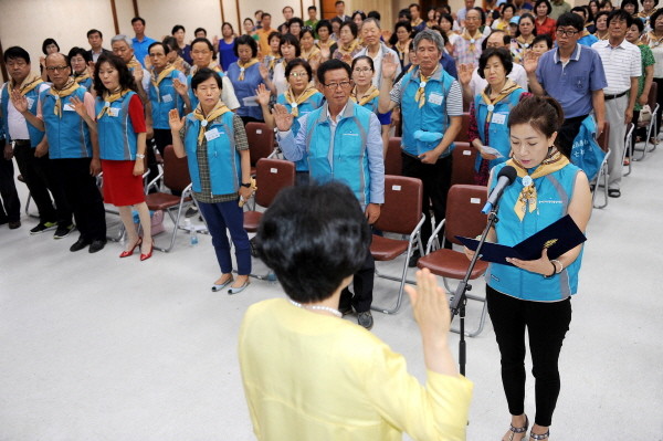 지난 15일 송파구청 대강당에서 열린 '송파안전지킴이(지역자율방재단) 발대식·교육'에서 김은영 송파안전지킴이 단원이 결의문 낭독을 하고 있다.(사진제공=송파구청)