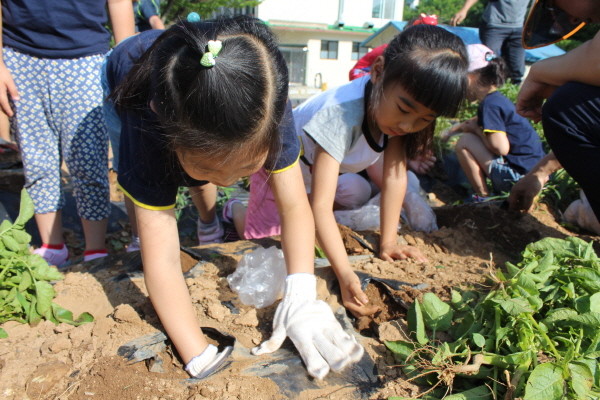인천 강화군 하점초등학교 학생들이 직접 텃밭에 농작물을 심고 키우는 건강한 수확체험 을 했다. 사진은 지난 봄 텃밭에 심은 농작물을 수확하고 있는 학생들의 모습.(사진제공=강화교육지원청)