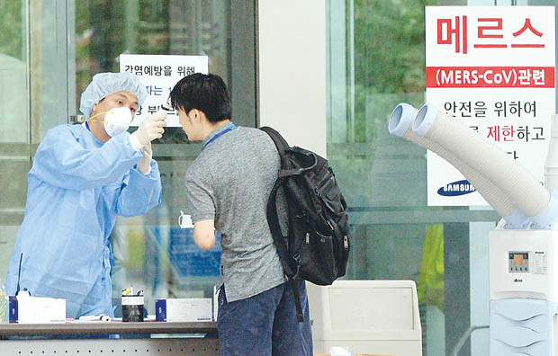 중동호흡기증후군(메르스) 추가 확진자가 14일째 나타나지 않아 마지막 남은 집중관리병원인 삼성서울병원의 부분폐쇄가 20일 밤 12시를 기해 해제될 예정이다. 이로써 집중관리병원으로 지정된 총 15개 병원 해제가 모두 완료된다. 사진은 19일 오전 서울 강남구 일원동 삼성서울병원 입구에서 병원 관계자가 출입하는 직원과 방문객의 체온을 검사하는 모습. 삼성서울병원은 부분폐쇄가 해제되는 20일 이후 서울시 재개원 관련 점검 수행 등 행정 절차를 거친 뒤 즉각대응팀과 정상진료를 위한 재개원을 검토할 예정이다.