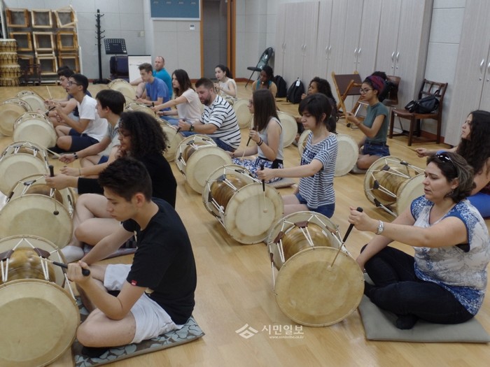 ‘청소년 해외교류 사업’의 일환으로 이달14~21일 서울 구로구를 방문한 프랑스 이씨레물리노시 청소년 대표단이 장구체험교실에서 장구치는 방법에 대해 교육을 받고 있다.(사진제공=구로구청)