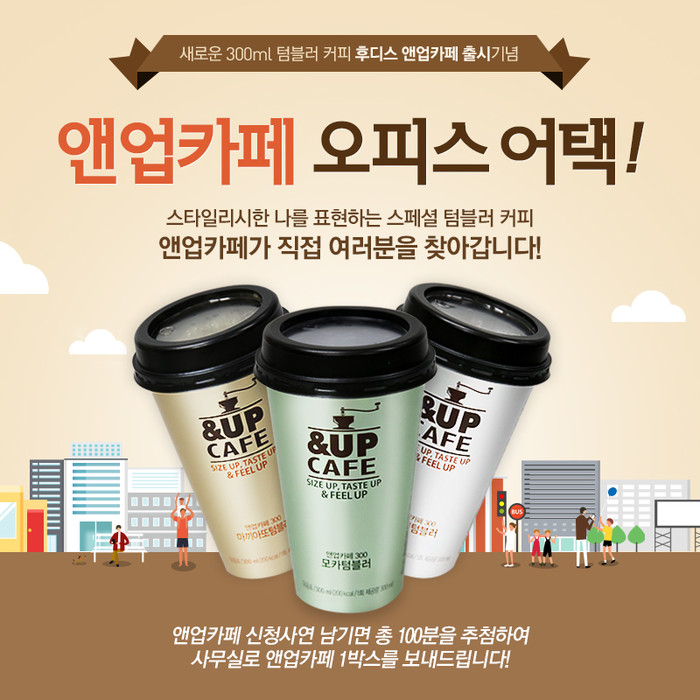 일동후디스의 <앤업카페300>은 300ml대용량 텀블러 컵커피로 기존의 200~250ml의 컵커피 제품보다 크기를 키워 풍성한 만족감을 원하는 소비자들의 니즈를 충족시키는 제품이다. 정통 융드립으로 추출한 100% 아라비카 원두 추출액에 1A등급 원유를 사용해 커피전문점에서 바리스타가 만든 신선한 커피의 맛을 담고 있다. 6월 출시하자마자 대형마트, 백화점 및 편의점 등 다양한 유통매장에서 판매하고 있고 ‘대용량커피, 텀블러커피’로 입소문까지 나면서 인기리에 판매되고 있다.