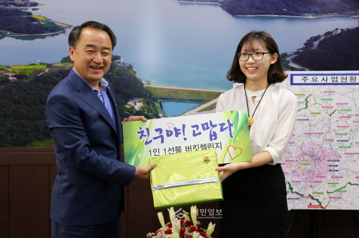 | ▲ 공무원의 아이디어로 시작된 자발적인 선물 릴레이‘만원의 행복 전통 시장 1인 1 선물하기 운동’에 참여한 황은성 시장(왼쪽)이 한 직원에게 선물을 건네고 있다.(사진제공=안성시청) | ||
