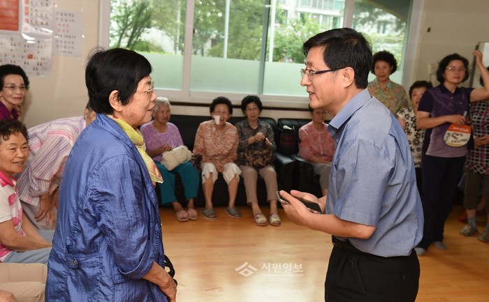 서울 노원구는 지난 20일 오전 10시부터 상계9동 주공14단지아파트 경로당외 3곳을 돌며 민생현장 방문을 실시한 가운데 김성환 구청장(오른쪽)이 상계9동 주공12단지경로당을 방문해 한 노인의 건의사항을 경청하고 있다.