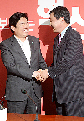 새누리당 원유철(왼쪽) 원내대표와 새정치민주연합 이종걸 원내대표가 21일 오후 서울 여의도 국회에서 만나 인사를 나누고 있다. 여야는 국가정보원 해킹 프로그램 의혹의 진상규명 방식과 정부 제출 추가경정예산안(추경) 처리 일정 등을 논의했다.