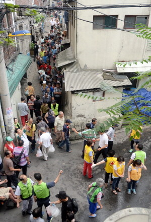 대한적십자사 서울지사 봉사자들이 22일 오후 서울 남대문 쪽방촌 주민들에게 삼계탕 나눔 행사를 하고 있다.