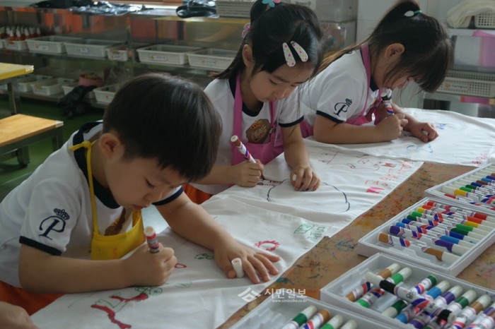 경북 구미시 해마루초등학교 병설유치원이 지난 21일 원아 66명을 대상으로 구미 유아교육체험장 견학을 실시했다. 사진은 이날 체험학습에 참여한 어린이들이 천연염색 체험을 위해 직접 손수건에 그림을 그리고 있는 모습.